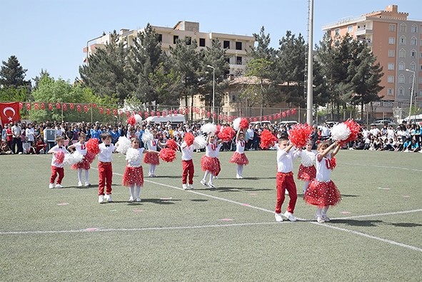 Renkli görüntülere sahne olan 23 Nisan Ulusal Egemenlik ve Çocuk Bayramı kutlamaları, öğrencilerin sunduğu gösteriler beğeniyle izlendi.