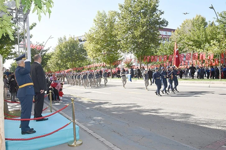 Vali Ekrem Canalp, Garnizon Komutanı Hv. Tuğg. İhsan Kaplan ile birlikte tören aracı üzerinde öğrencilerin ve halkın bayramını kutlamasıyla başlayan kutlama töreni; şehitler anısına saygı duruşu ve İstiklal Marşı’nın okunmasının ardından Cumhurbaşkanı Recep Tayyip Erdoğan’ın 29 Ekim Cumhuriyet Bayramı kutlama mesajının okunmasıyla devam etti.