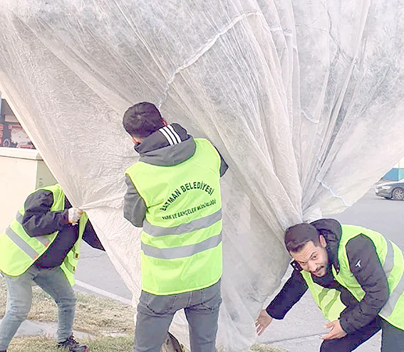 Zeytin ağaçlarına özel kırağı örtüsü uygulanırken, yaprak ve gövdelerin zarar görmemesi için titiz bir çalışma yapıldı.
