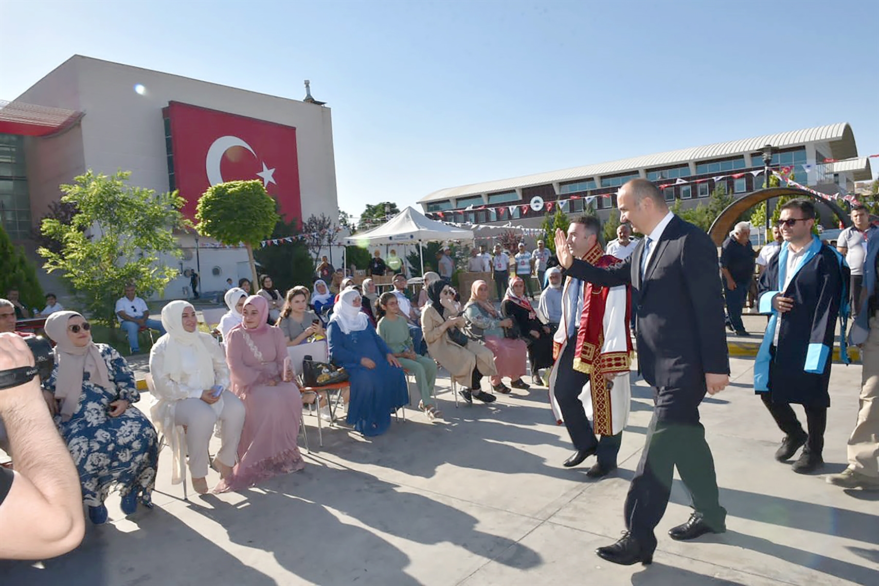 Kortej yürüyüşüyle tören alanına gelen mezunların yerlerini almalarıyla başlayan program, saygı duruşunun ardından İstiklal Marşının okunması ve açılış konuşmalarıyla devam etti.