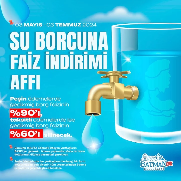 Su borcu indirimi 03.05.2024 Cuma günü başlayıp 03.07.2024 tarihinde son bulacak. Borcunu taksitle ödemek isteyen yurttaşların Batman Belediyesi Yeni Hizmet Binası BASKİ Müdürlüğüne gelerek, ödeme yapmadan önce bir form doldurarak dilekçe vermeleri gerekiyor. Peşin ödemelerde ise yurttaşlar, herhangi bir form doldurmadan belediyenin tüm veznelerinden ödeme işlemlerini gerçekleştirebilecek.
