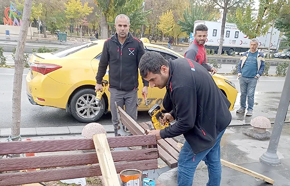 Park ve Bahçeler Müdürlüğü sorumluluk alanlarındaki yerlerde; iğneden ipliğe musluklar, süs havuzları, lavabolar, klozet ve wc’ler, aydınlatma direkleri, çöp kovaları, banklar, pergola, kamelya, spor aletleri, çocuk oyun grupları tamirat çalışması konusunda deneyimli ekiplerce devam ediyor.