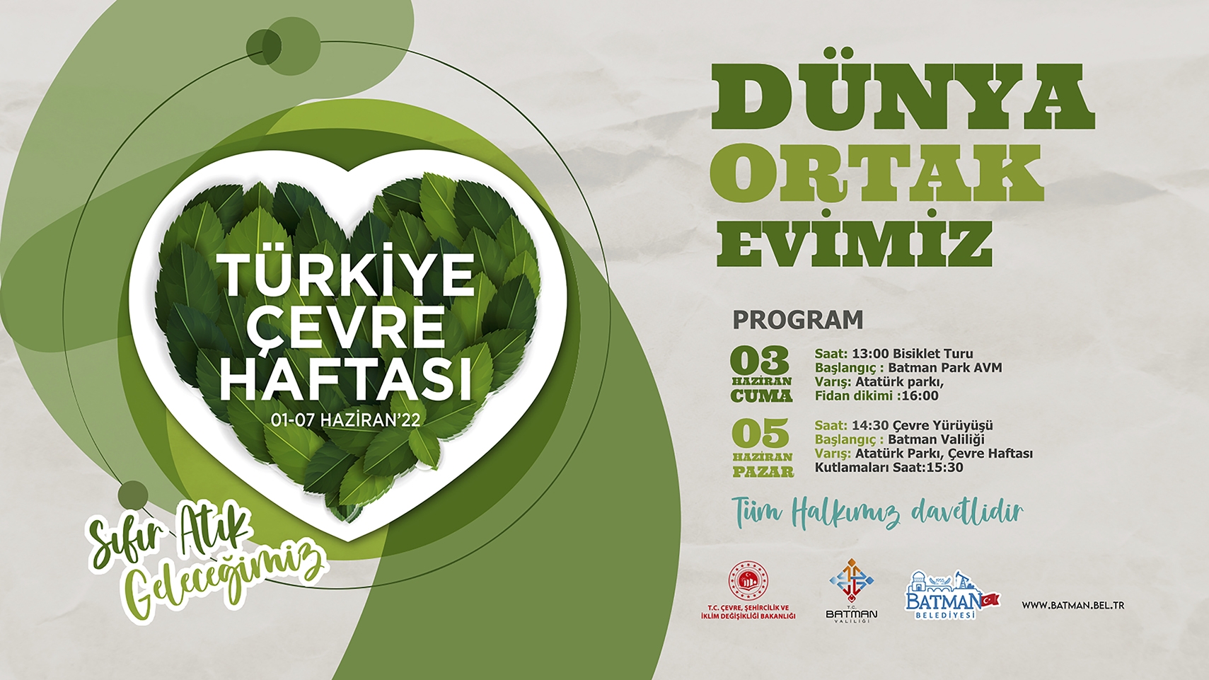 Öte yandan 5 Haziran 2022 Pazar günü ise Batman Valiliği, Çevre Şehircilik ve İklim Değişikliği Müdürlüğü ve Batman Belediyesi koordinesinde; Batman Valiliği önünde saat 14.30’da başlayıp Atatürk Parkı’nda son bulacak olan çevre yürüyüşünün ardından Atatürk Parkı’nda 15.30’da Çevre Haftası kutlamaları gerçekleştirilecek. Etkinliğe tüm Batmanlılar davetli.
