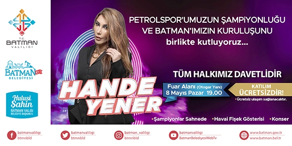 Şampiyon Petrolspor oyuncularının da sahneye çıkacağı kutlamada havai fişek gösterisin ardından muhteşem şarkıları ile Hande Yener sahne alacak.
