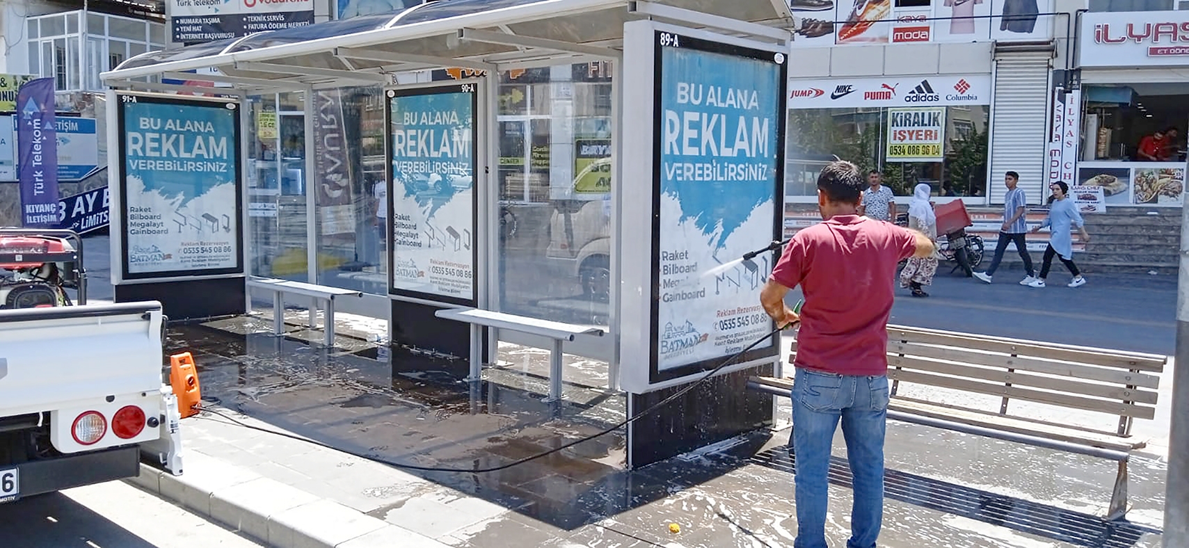 Batman kent genelinde vatandaşların ortak kullanım alanları arasında yer alan otobüs durakları 3 kişilik ekiple köpükle yıkanıp durulanarak temizleniyor.