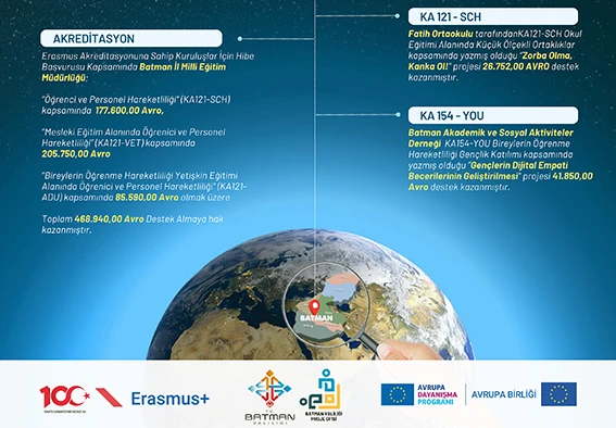 Akredite kuruluşu Batman İl Milli Eğitim Müdürlüğüne ise 3 akredite bileşen kapsamında 468.940,00 Avro tahsis edildi. Bu çerçevede Ana Eylem 1 (KA1) kapsamında ilimize tahsis edilen bütçe toplamı 629.975,00 Avro oldu.