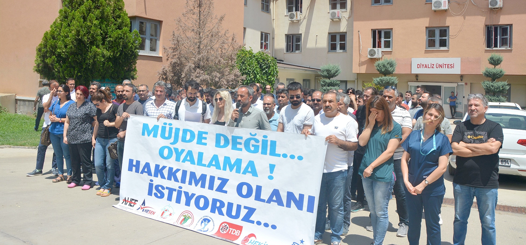 Bizler emekliliğe yansıyacak temel ücret artışı talep ederken, nitelikli şekilde ve baskı altında olmadan çalışabilmemiz için yeterli süre ve olanaklar, sağlıkta şiddetten arındırılmış çalışma alanları, toplumun daha az hastalanması için koruyucu sağlık hizmetlerinin güçlendirilmesini isterken; sizlerin bize reva gördüğü, performansa dayalı ödeme sistemini dayatmak, emeğimiz için ayrılması gereken bütçeyi şehir hastanelerine kira ve hizmet bedeli olarak gömmek oldu. Sizin bizlere dayattığınız sağlıksızlığa karşı bizler bu gidişatı değiştirmek, sağlıklı bir gelecek için birlikteyiz” denildi.