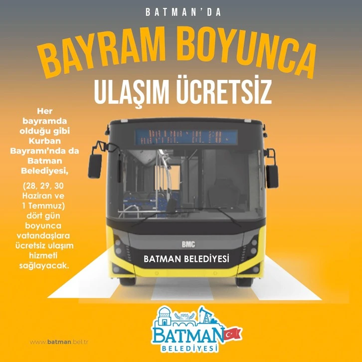 Her bayramda olduğu gibi Kurban Bayramı’nda da Batman Belediyesi, (28, 29, 30 Haziran ve 1 Temmuz) dört gün boyunca vatandaşlara ücretsiz ulaşım hizmeti sağlayacak.