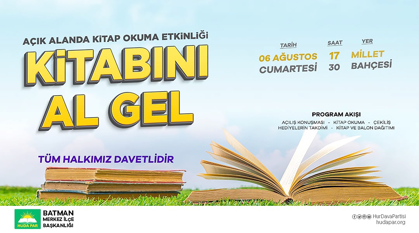 HÜDA PAR Merkez İlçe Başkanlığı tarafından yapılan yazılı açıklamada, “toplumu teknolojik bağımlılıktan kurtarmak ve okumaya yönelik bir farkındalık oluşturmak” amacıyla 6 Ağustos Cumartesi günü saat 17.30'da Millet Bahçesinde kitap okuma etkinliğinin düzenleneceği belirtildi.