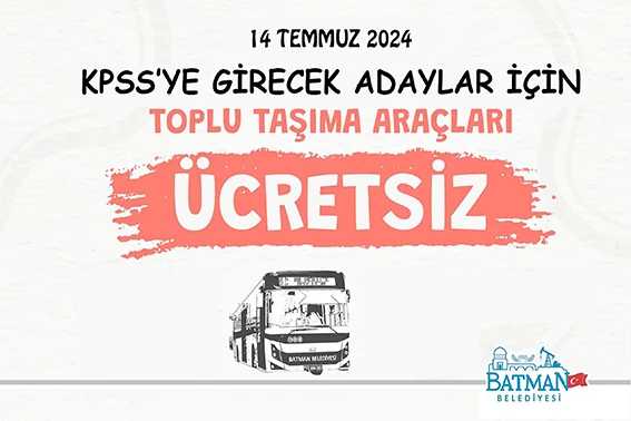 Belediye tarafından yapılan duyuruda “Batman Belediye otobüsleri, 14 Temmuz 2024 Pazar günü yapılacak olan KPSS Lisans sınavına girecek adaylar sınav giriş belgelerini göstermesi halinde belediye toplu taşıma otobüslerinden ücretsiz yararlanabilecek. Öğrencilerimize ve halkımıza duyurulur” denildi.