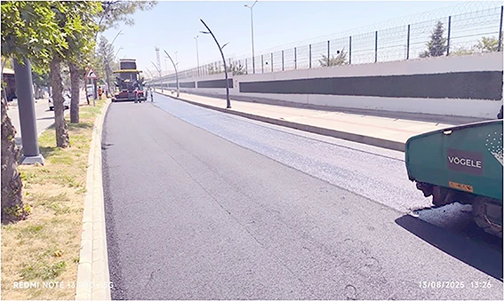 Geçtiğimiz yıl binder tabakası serilen yolda, zeminin tamamen oturmasının ardından aşınma tabakası asfalt serimine geçildi. Çalışmalar kapsamında binder ve aşınma tabakası arasına finişerlerle asfalt uygulamasının yapıldığı belirtildi.
