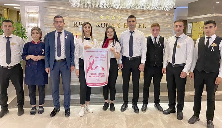 Farkındalık çalışması hakkında bilgi veren Real Konak Hotel Genel Müdürü Sinan Sarı “1-31 Ekim tarihleri Meme Kanseri Farkındalık Ayı olarak belirlenmiştir. Başta kadın çalışanlarımız olmak üzere, tüm kadınlarımızı bilgilendiriyor, erken teşhis ve düzenli kontrolün önemine dikkat çekiyoruz. Meme kanseri dünyada olduğu gibi Türkiye’de de kadınlarda görülen her dört kanserden birini oluşturuyor. Bu duruma dikkat çekmek ve farkındalığı artırmak için otel çalışanları da bu ay pembe kurdele takıp misafirlerini meme kanseri hakkında bilgilendirecek. Sağlıklı Günler Dileriz” dedi.