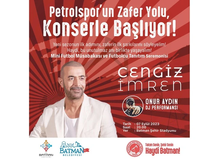 Batman Belediyesi ve TPAO Batman Petrolspor işbirliğiyle düzenlenecek konsere Batmanlı Futbolseverlerin ilgi göstermesi bekleniyor. İl yöneticileri, STK ve futbolseverlerin katılacağı konserde sanatçı İmren, sahne alacak.