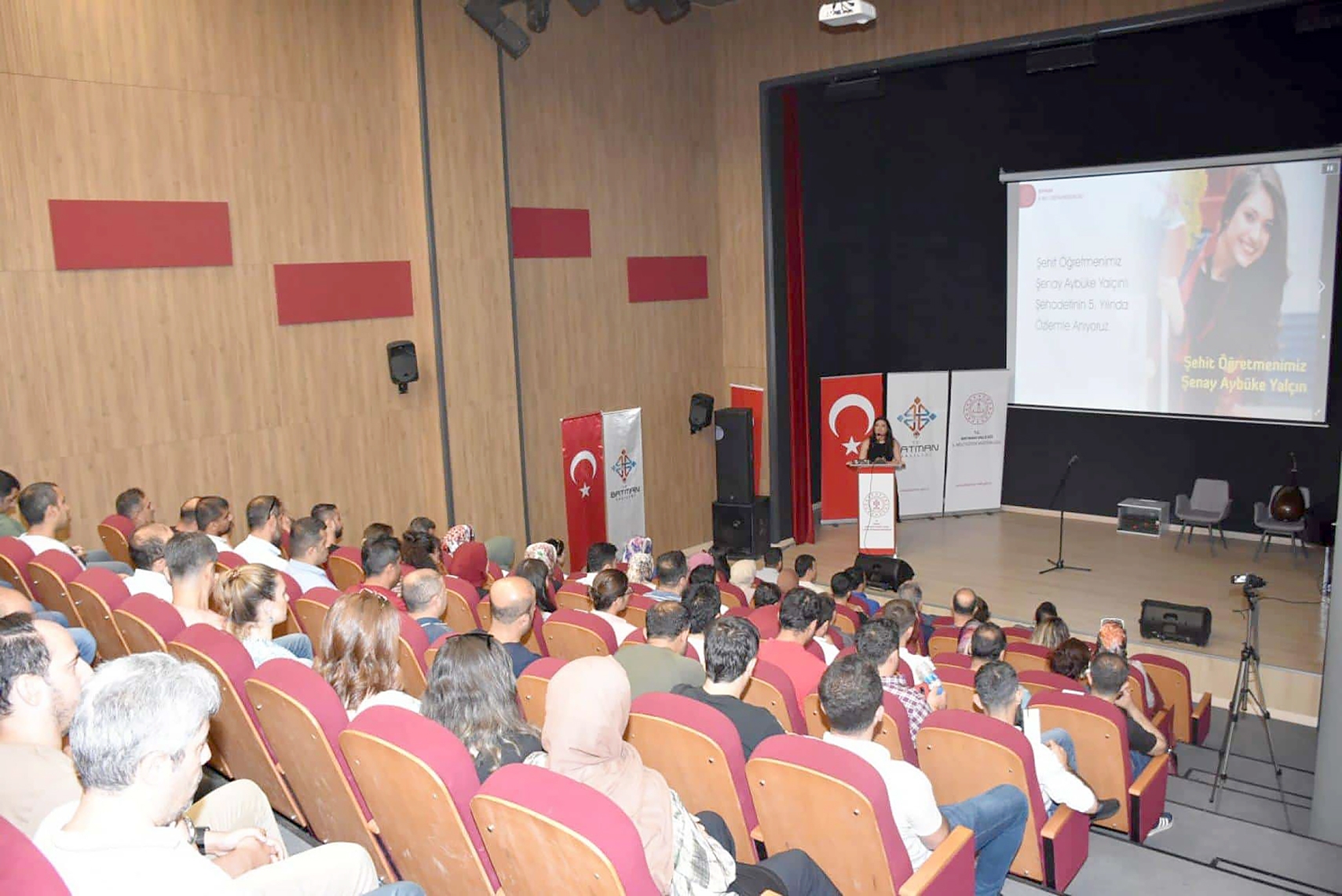 Müdür Kurtaran'ın konuşmasının ardından Şehit Öğretmenin mesai arkadaşları Duygu Tunç ve Hakan Karabulut sırayla kürsüye gelerek Şehit Öğretmen Şenay Aybüke Yalçın ile ilgili anılarını ve duygularını anlattılar.