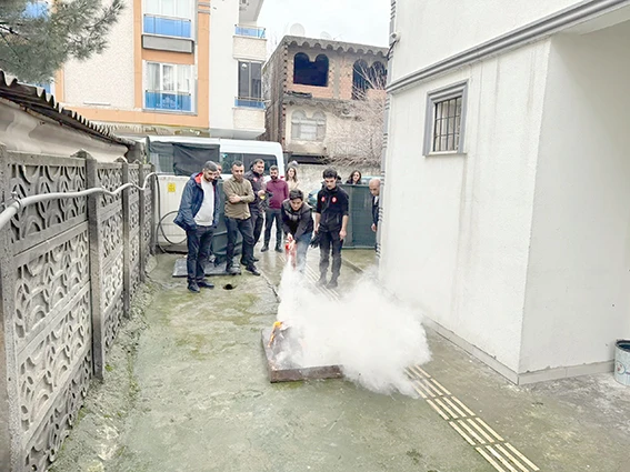 Eğitim kapsamında teorik bilgilendirmenin yanı sıra uygulamalı yangın tatbikatı da gerçekleştirildi.
