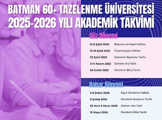 Bu yıl ikinci dönem öğrencilerini alacak olan 60+ Tazelenme Üniversitesi projesinde, 2025-2026 eğitim-öğretim dönemi akademik takvimi belli oldu. Batman Üniversitesi Merkez Kampüste eğitime devam edecek olan Tazelenme Üniversitesinde Güz ve Bahar Dönemini kapsayan takvime göre; öğrenciler 8-12 Eylül 2025 tarihleri arasında başvuru ve kayıt işlemlerini gerçekleştirebilecek. 15-19 Eylül 2025 tarihleri arasında oryantasyon programı düzenlenecek ve yeni dönemin dersleri 22 Eylül 2025 tarihinde başlayacak. Güz dönemi dersleri 26 Aralık 2025 tarihinde sona erecek. Bahar Dönemi için ise kayıt yenileme işlemleri 2-6 Şubat 2026 tarihleri arasında yapılacak ve dersler 9 Şubat 2026 tarihinde başlayacak. Bahar dönemi derslerinin ise 15 Mayıs 2026 tarihinde tamamlanması öngörülüyor.