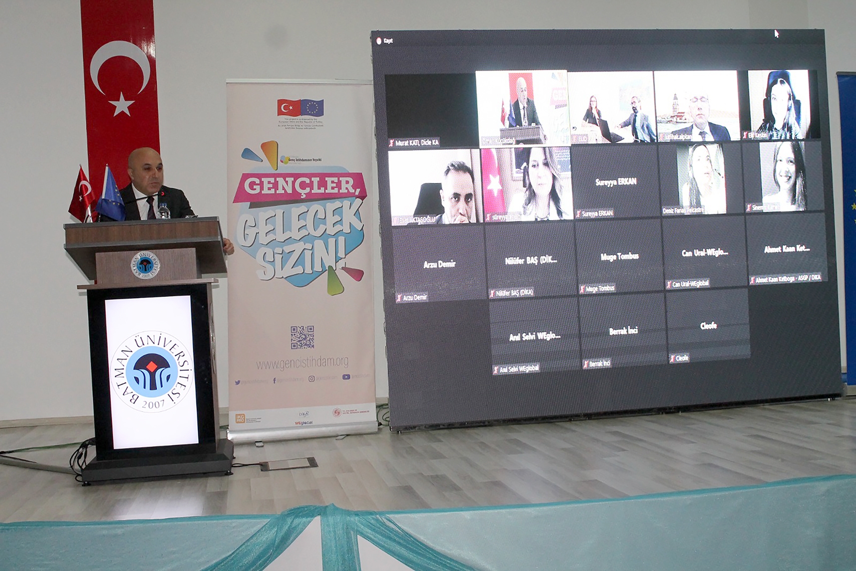 Batman Üniversitesi Batı Raman Kampüsü Rektörlük Konferans Salonunda gerçekleştirilen toplantıya Çalışma ve Sosyal Güvenlik Bakanlığı Bakan Yardımcısı Prof. Dr. Lütfihak Alpkan ve Avrupa Birliği Türkiye Delegasyonu AB Politikaları Program Müdürü Tsvetana Stoycheva çevrimiçi katılırken Batman Üniversitesi Rektör Yardımcısı Prof. Dr. Necmettin Sezgin, Siirt Üniversitesi Rektör Yardımcısı Prof. Dr. Tekin Şahin, Dicle Kalkınma Ajansı Genel Sekreteri Ahmet Alanlı, İktisadi ve İdari Bilimler Fakültesi Dekanı Prof. Dr. Mehmet Onur Gülbahar, Kariyer Merkez Müdürü ve Uluslarararası İlişkiler Bölüm Başkanı Doç. Dr. Fulya Köksoy, Teknoloji Transfer Ofisi Müdürü Doç. Dr. Musa Kılıç, üniversite yöneticileri, akademik personel ve öğrenciler katıldı.